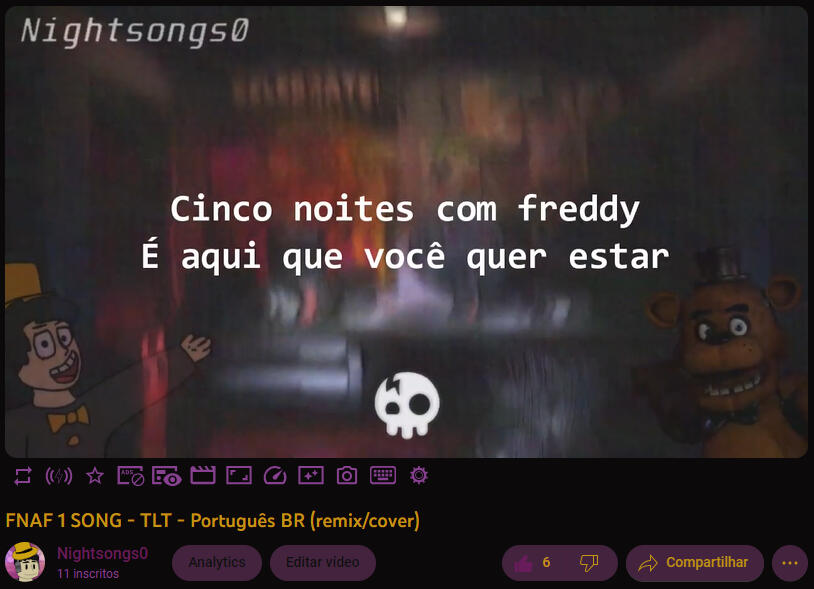 Nightsongs0Eu também tenho um canal de música, posto covers e remixes de várias músicas, eu posto vídeo de música de vez enquanto, então meus vídeos de música não são tão interessantes, caso queira ouvir alguma remix/cover meu é só clicar no botão abaixo: